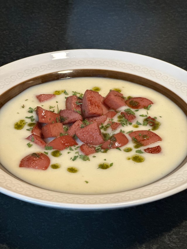 Ettersom jeg hadde noen kyllingpølser fra datodisken hos Coop liggende ble de brukt som topping etter å ha blitt kuttet i små terninger og gitt en god runde i jernpanna. Her kan man bruke sprøstekt spekeskinke, bacon, vanlig kjøttpølse eller ingenting. Man kan ha oppi noen ekstra kvaster med blomkål også. Men Ingrid stod fortsatt og pikka meg litt i nakken med sleiva si så det var bare å finne frem persillen og strø litt grønt over så det så ut som man var på fin-fin restaurant og ikke hjemme på eget kjøkken.